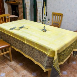 Un dessin élégant est placé au centre de la nappe. Et s’achève par un drapé de part et d’autre d’une frise fleurie, mélangeant ainsi le noir et le jaune.