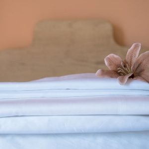 – Drap de dessus : avec une fine surpiqûre en tête de lit qui marque l’ourlet pour donner plus d’élégance au drap, tout en ne nous faisant pas perdre la douceur au contact de la peau.